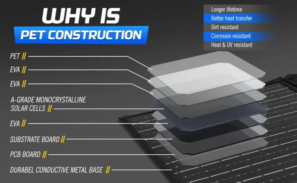 2- خفة الوزن : لوح طاقة شمسية قابل للطي فائق النحافة ويزن 7 كجم فقط ويمكن طيه في ثمن حجمه الكامل كما انه مصنوع من قماش قطن .