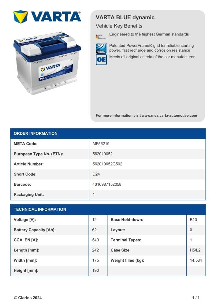 بطارية فارتا 62 أمبير أسباني VARTA BLUE DYNAMIC 62 Ah 12V MF56219