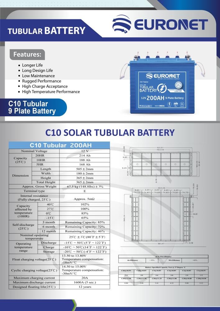 بطارية 12 فولت 200 أمبير - النوع: تيوبلر C10 عمر طويل - الوزن: 68 كجم - مدة الضمان: سنة - عمر افتراضي 5 سنوات أو اكثر حسب نسبة التفريغ